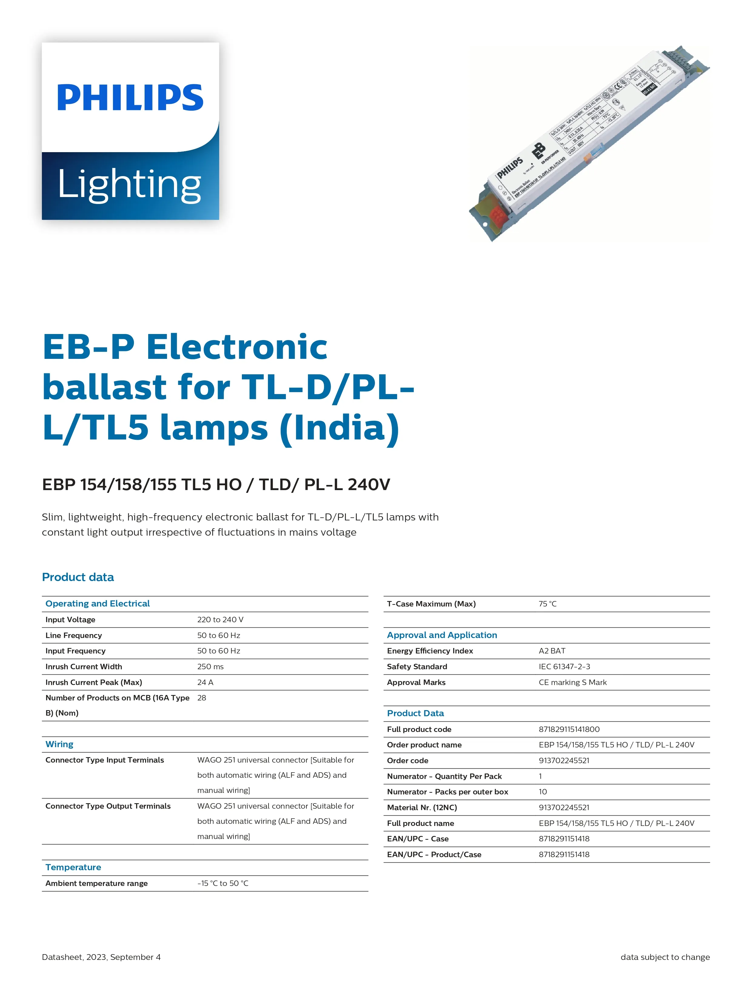 Chấn lưu điện tử Philips EB-P 158 dành cho bóng đèn huỳnh quang dưới 58W