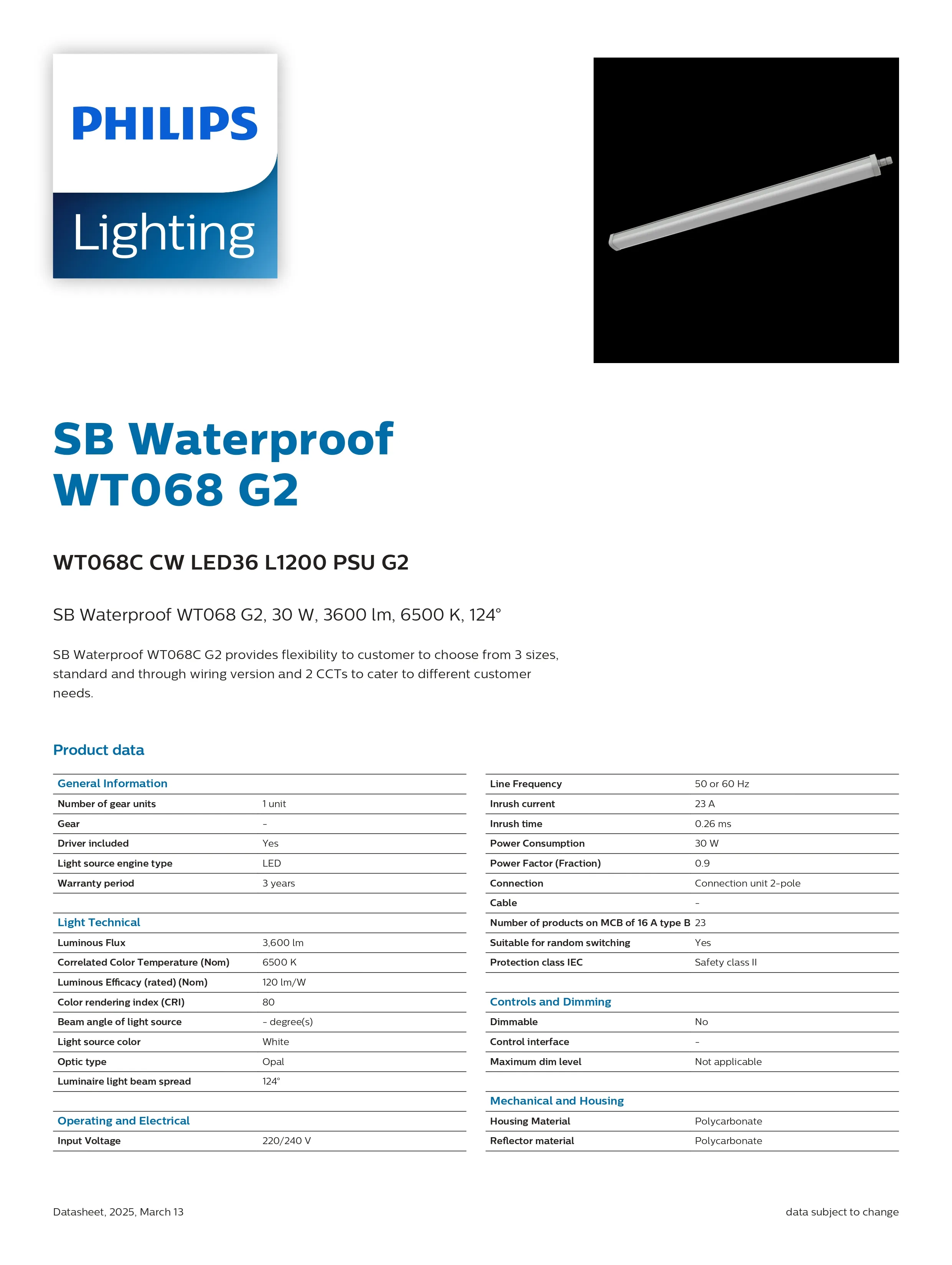 Đèn LED chống thấm WT068C CW LED36 L1200 PSU G2