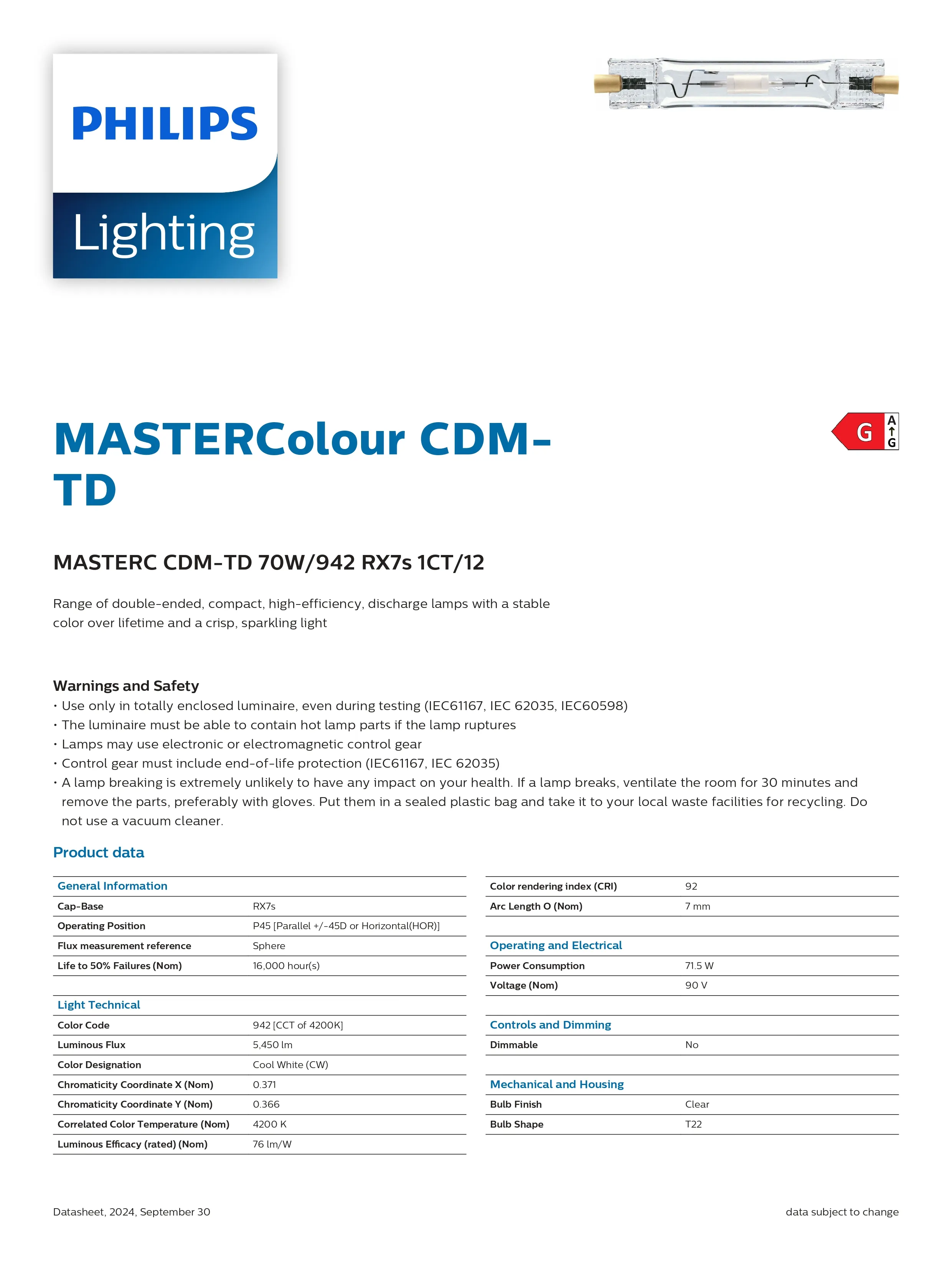 Bóng đèn cao áp Philips MASTERC CDM-TD 70W/942 RX7s 1CT/12