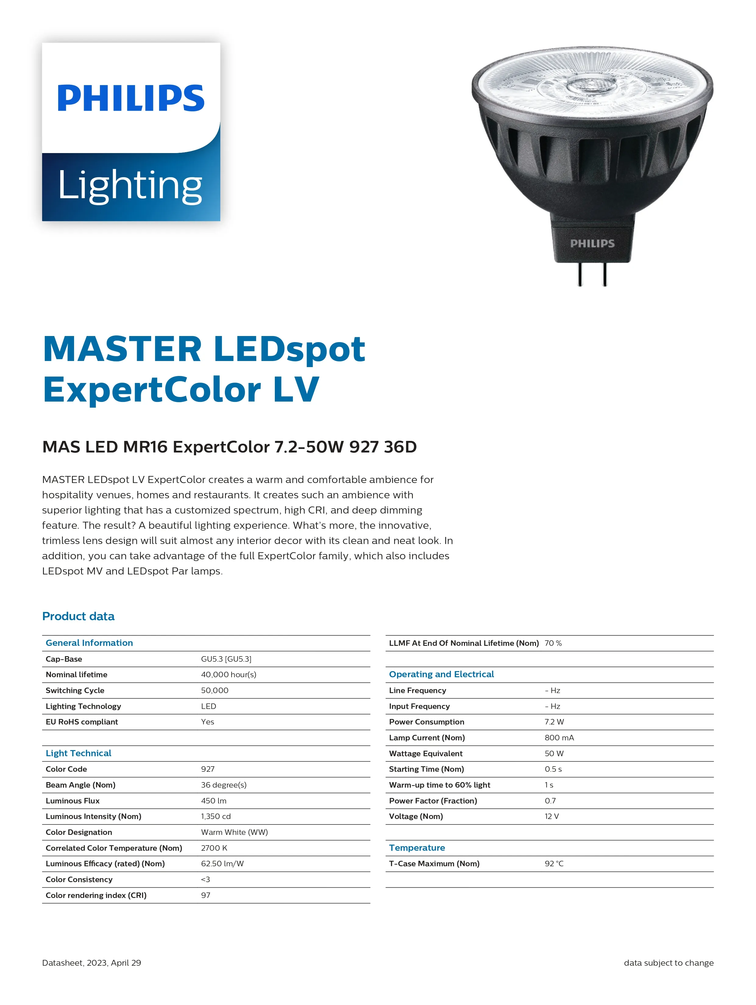 Bóng đèn Philips Mas Led MR16 ExpertColour 7.2-50w 927 36D